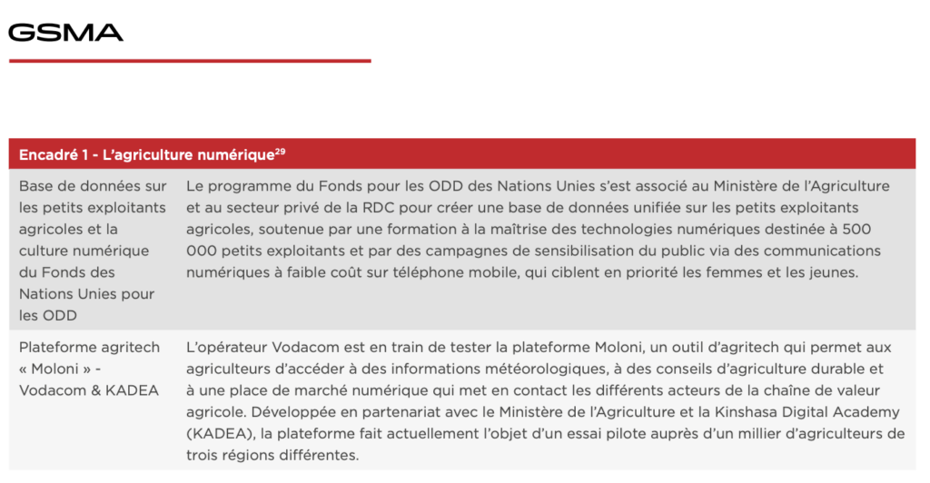 Moloni, a project led by the Vodacom Digital and Kadea, is proud to be featured in the official GSMA Digital Economy in the DRC Report. This report highlights Moloni as a leading Agritech tool that connects farmers to weather data, sustainable advice, and a digital marketplace. Our ongoing pilot project, in partnership with the Ministry of Agriculture, demonstrates our commitment to leveraging digital technology for sustainable agricultural growth in the DRC.